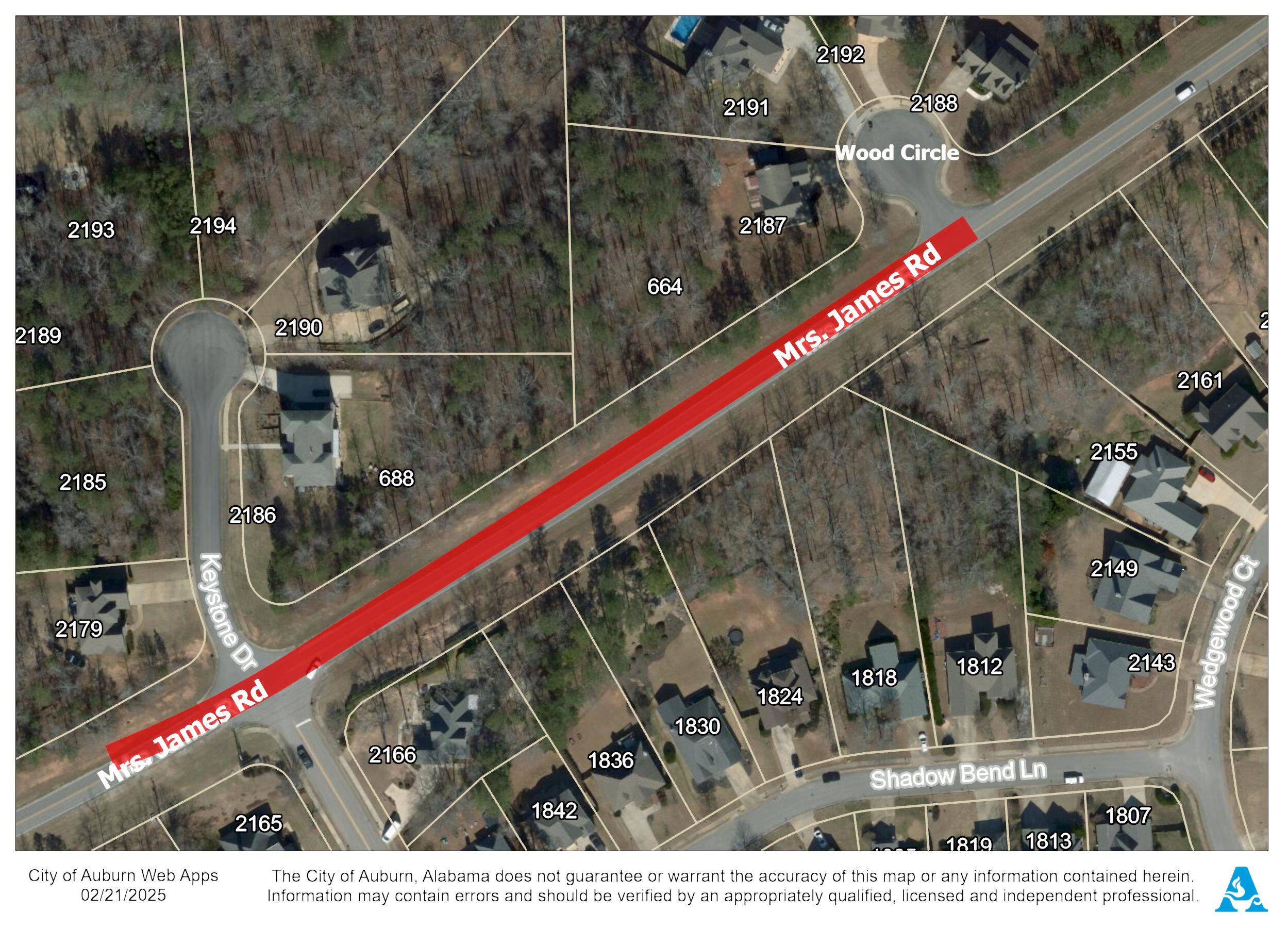 Feb. 21: Auburn, Ala. - Paving work is expected on Mrs. James Road from Wood Circle to Keystone Drive on Monday and Tuesday, Feb. 24-25. Work is expected to take place between 8:30 a.m. and 5 p.m.