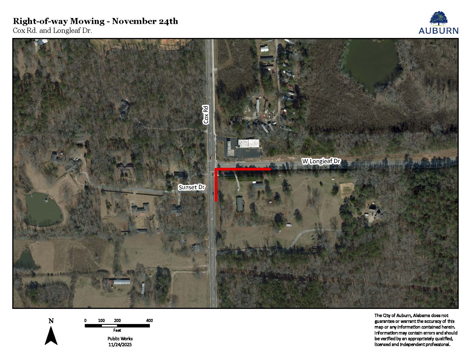 AUBURN, Ala. - Public Works crews will be performing right of way maintenance work near the intersection of Cox Road and Longleaf Drive today, Nov. 24.