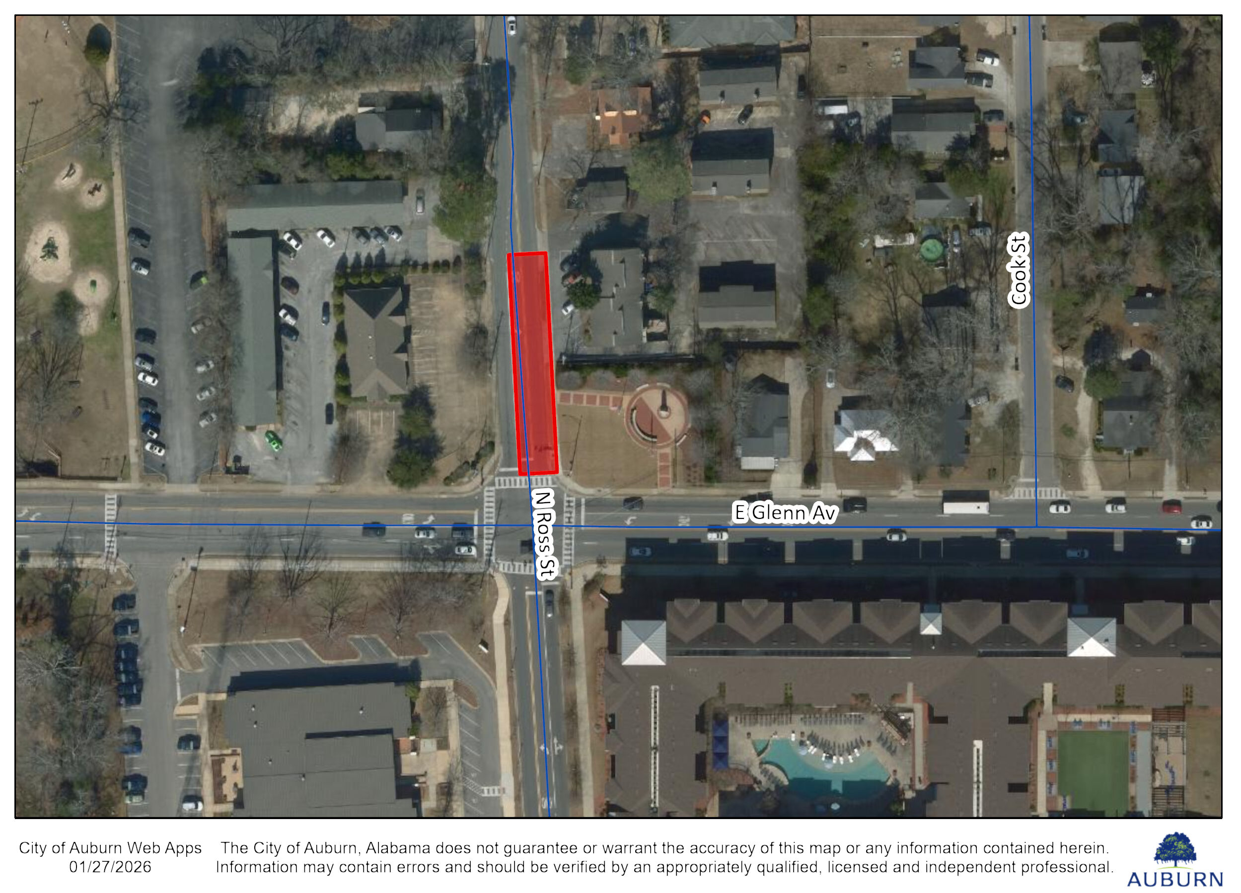 AUBURN- The northbound lane and left turn lane on North Ross Street just north of the East Glenn Avenue intersection are closed today, Jan. 27, for a water main repair. The southbound lane remains open to through traffic. Work is expected to take 4-6 hours to complete. The repair is expected to cause a water outage along North Ross Street between East Glenn Avenue and Opelika Road.